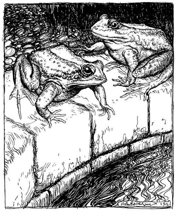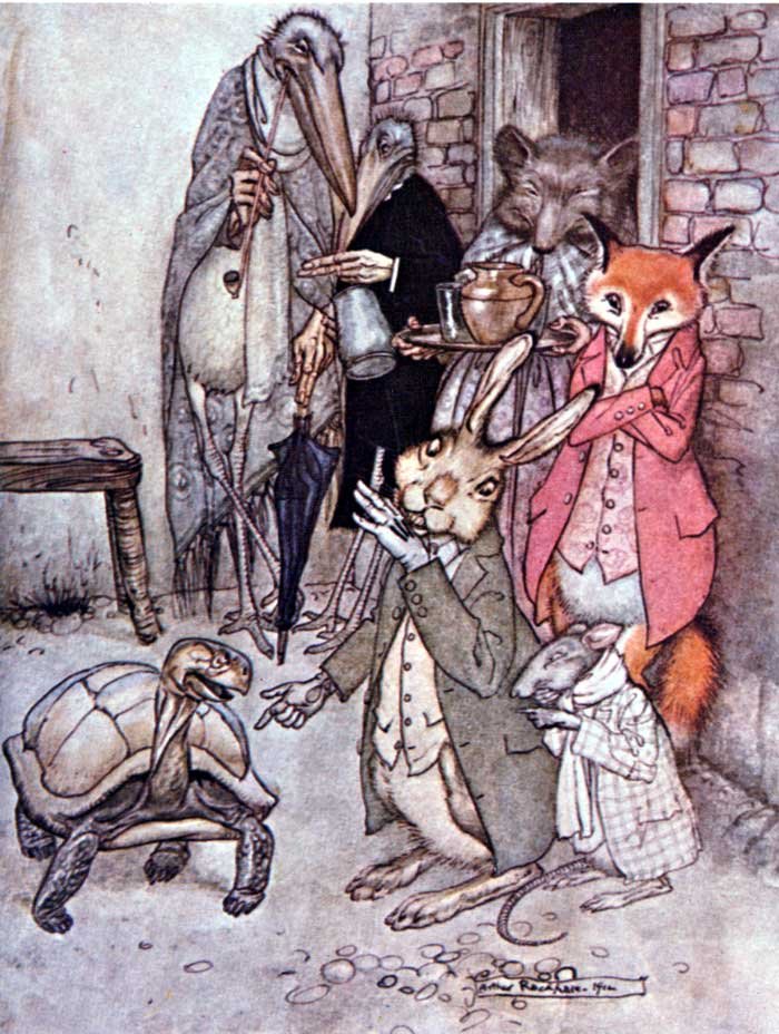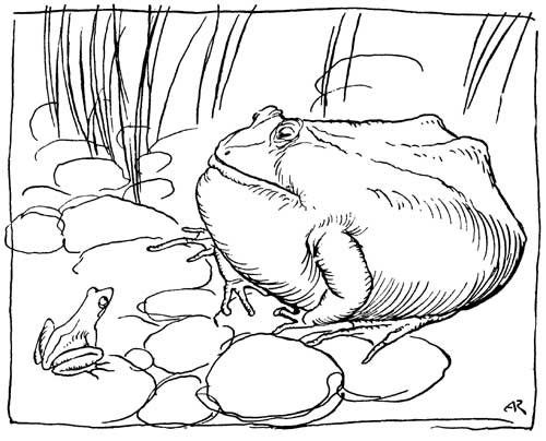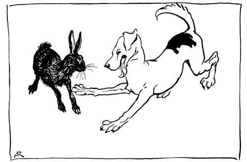 The Hares once gathered together and lamented the unhappiness of their lot, exposed as they were to dangers on all sides and lacking the strength and the courage to hold their own. Men, dogs, birds and beasts of prey were all their enemies, and killed and devoured them daily: and sooner than endure such persecution any longer, they one and all determined to end their miserable lives. Thus resolved and desperate, they rushed in a body towards a neighbouring pool, intending to drown themselves. On the bank were sitting a number of Frogs, who, when they heard the noise of the Hares as they ran, with one accord leaped into the water and hid themselves in the depths. Then one of the older Hares who was wiser than the rest cried out to his companions, "Stop, my friends, take heart; don't let us destroy ourselves after all: see, here are creatures who are afraid of us, and who must, therefore, be still more timid than ourselves."