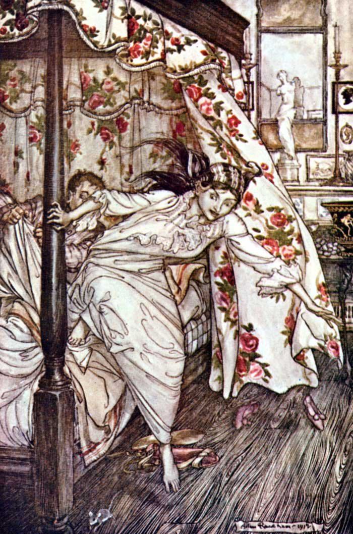 A Widow, thrifty and industrious, had two servants, whom she kept pretty hard at work. They were not allowed to lie long abed in the mornings, but the old lady had them up and doing as soon as the cock crew. They disliked intensely having to get up at such an hour, especially in winter-time: and they thought that if it were not for the cock waking up their Mistress so horribly early, they could sleep longer. So they caught it and wrung its neck. But they weren't prepared for the consequences. For what happened was that their Mistress, not hearing the cock crow as usual, waked them up earlier than ever, and set them to work in the middle of the night.