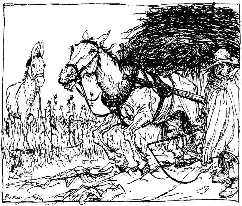 An Ass and a Fox went into partnership and sallied out to forage for food together. They hadn't gone far before they saw a Lion coming their way, at which they were both dreadfully frightened. But the Fox thought he saw a way of saving his own skin, and went boldly up to the Lion and whispered in his ear, "I'll manage that you shall get hold of the Ass without the trouble of stalking him, if you'll promise to let me go free." The Lion agreed to this, and the Fox then rejoined his companion and contrived before long to lead him by a hidden pit, which some hunter had dug as a trap for wild animals, and into which he fell. When the Lion saw that the Ass was safely caught and couldn't get away, it was to the Fox that he first turned his attention, and he soon finished him off, and then at his leisure proceeded to feast upon the Ass.