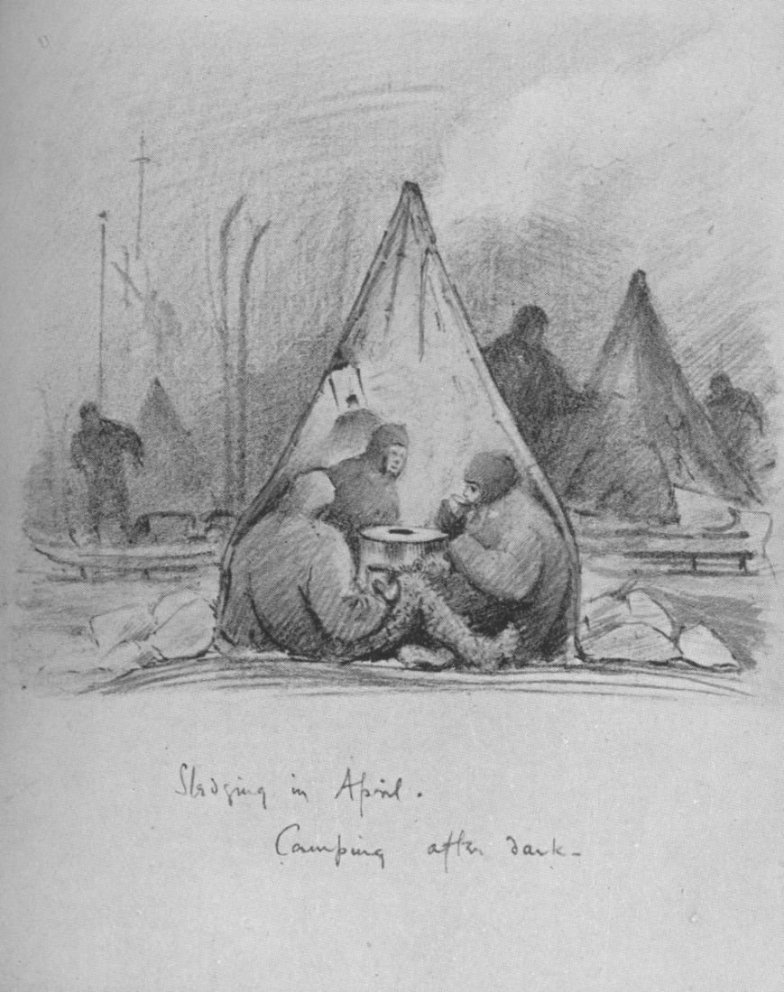 "I was feeling as if I should crack, and accepted Birdie's eider-down. It was wonderfully self-sacrificing of him: more than I can write. I felt a brute to take it, but I was getting useless unless I got some sleep which my big bag would not allow. Bill and Birdie kept on telling me to do less: that I was doing more than my share of the work: but I think that I was getting more and more weak. Birdie kept wonderfully strong: he slept most of the night: the difficulty for him was to get into his bag without going to sleep. He kept the meteorological log untiringly, but some of these nights he had to give it up for the time because he could not keep awake. He used to fall asleep with his pannikin in his hand and let it fall: and sometimes he had the primus.