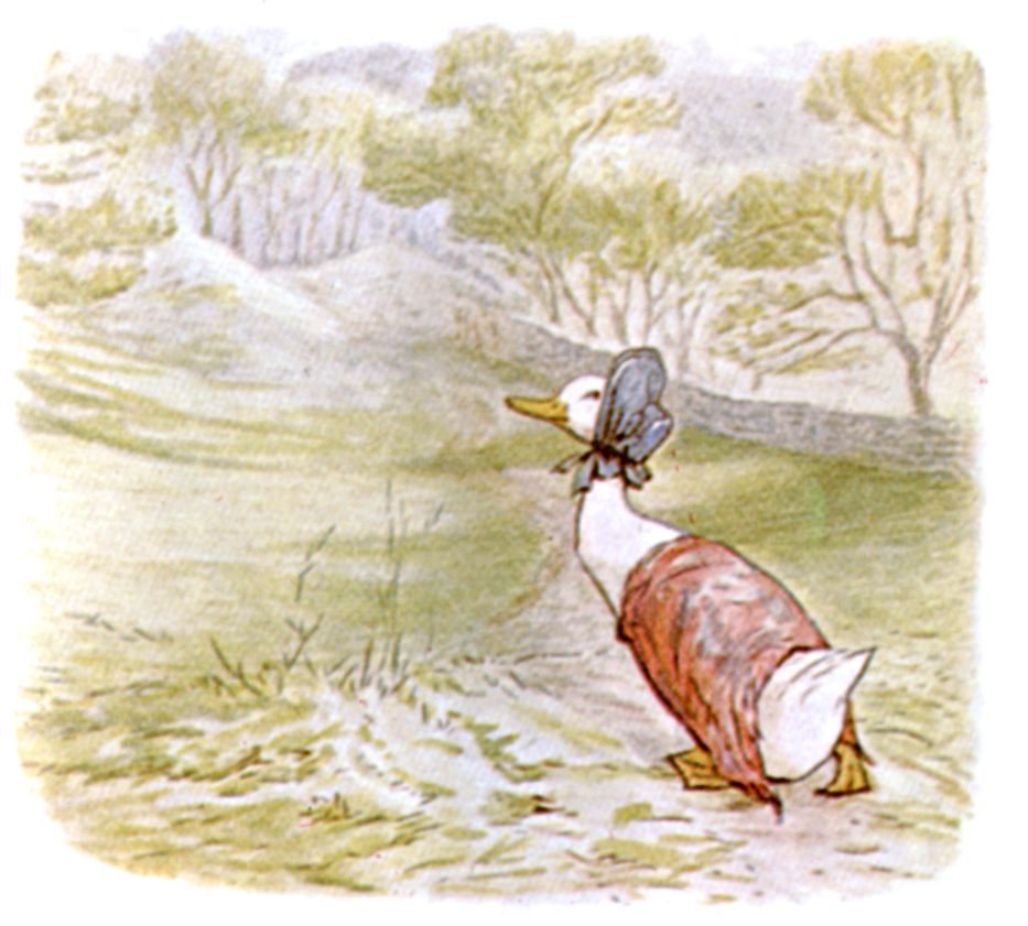 Jemima Puddle-duck went up the cart-road for the last time, on a sunny afternoon. She was rather burdened with bunches of herbs and two onions in a bag.