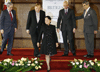 President Gloria Macapagal-Arroyo is all smiles as she prepares to leave the stage after the opening ceremonies of "Bridges: Dialogues Towards a Culture of Peace" Wednesday (Nov. 14) at Malacanang's Rizal Hall. The Bridges Program is a first of its kind in the Association of Southeast Asian Nations (ASEAN), with a lecture series in 2007 and 2008 in Thailand and the Philippines before it moves to Malaysia in late 2008 and into 2009. With the President in photo are (from left) Asian Institute of Management (AIM) president Francis Estrada, Nobel Economics Laureate Professor Robert Alexander Mundell, founding chairman of the International Peace Foundation Uwe Morawetz, and Jaime Augusto Zobel de Ayala, chairman and chief executive officer of the Ayala Corporation and Philippine chairman of Bridges Program. (Dado Aguilar/OPS-NIB Photo) | ||