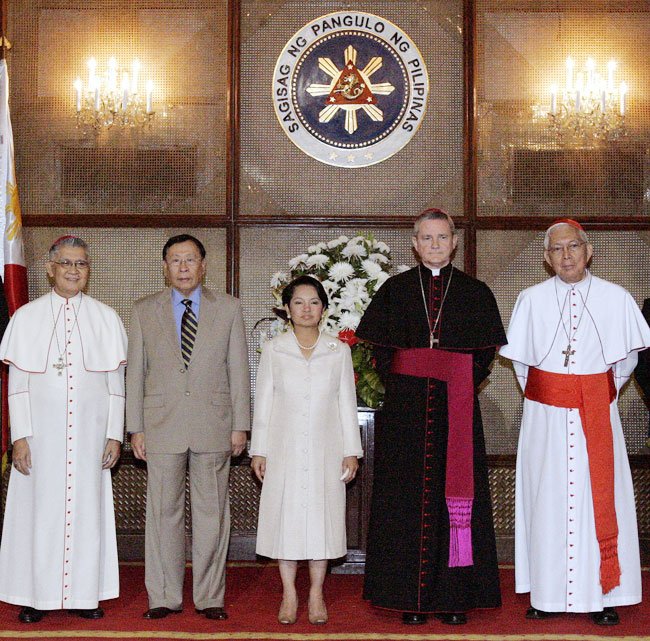| President Gloria Macapagal-Arroyo poses with Apostolic Nuncio to the Philippines Archbishop Edward Joseph Adams (second from right) after the presentation of his credentials Friday (Nov. 16) at Malacanang's Rizal Hall. Also in photo are (from left) Catholic Bishops Conference of the Philippines (CBCP) president Archbishop Angel Lagdameo, Foreign Affairs Secretary Alberto Romulo and Manila Archbishop Gaudencio Cardinal Rosales. (Marcelino Pascua-OPS/NIB Photo) | ||