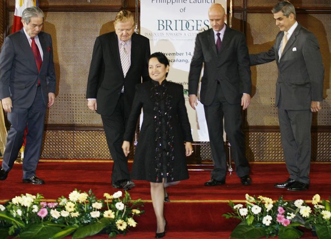 | President Gloria Macapagal-Arroyo is all smiles as she prepares to leave the stage after the opening ceremonies of "Bridges: Dialogues Towards a Culture of Peace" Wednesday (Nov. 14) at Malacanang's Rizal Hall. The Bridges Program is a first of its kind in the Association of Southeast Asian Nations (ASEAN), with a lecture series in 2007 and 2008 in Thailand and the Philippines before it moves to Malaysia in late 2008 and into 2009. With the President in photo are (from left) Asian Institute of Management (AIM) president Francis Estrada, Nobel Economics Laureate Professor Robert Alexander Mundell, founding chairman of the International Peace Foundation Uwe Morawetz, and Jaime Augusto Zobel de Ayala, chairman and chief executive officer of the Ayala Corporation and Philippine chairman of Bridges Program. (Dado Aguilar/OPS-NIB Photo) | ||