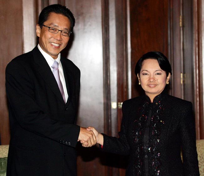 | President Gloria Macapagal-Arroyo welcomes Ho Kwon Ping, chief executive officer of Singapore’s Banyan Tree Group, during a courtesy call on her Wednesday (Nov. 14) at Malacanang's Music Room. The Banyan Tree Group executive informed the President that his company is pushing through with its plan to develop two resorts in Dinalan Island, Palawan at a cost of US$70 million. (Rico Borja/OPS-NIB Photo) | ||