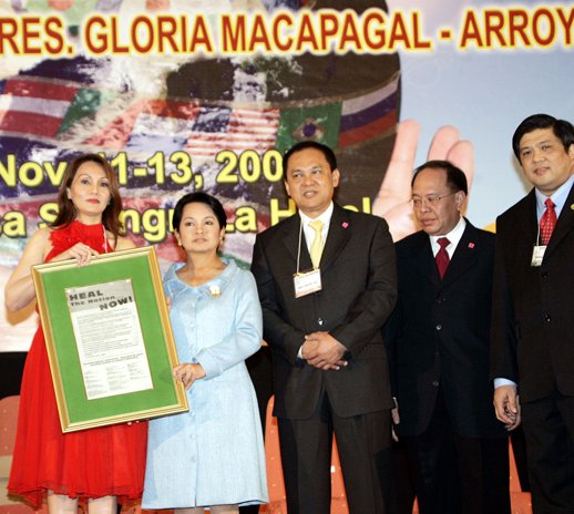 President Gloria Macapagal-Arroyo receives a framed “Heal the Nation Now Manifesto” (a call for national solidarity and healing not only physically but spiritually and politically) from Dr. Daisy Camitan, chairperson of the 13th Academic Meeting and Annual Convention of the Philippine Academy of Medical Specialists (PAMS), before she addressed the conference at the Isla Ballroom of the EDSA Shangri-La Hotel in Mandaluyong City Monday (Nov.12). Also in photo are (from right) Dr. Jerrimo Genuino, PAMS-Cavite Chapter chair; National Director for Special Concerns of the Department of Health Dr. Elmer Punzalan, and PAMS president Dr. Rene Catan. (Marcelino Pascua /OPS-NIB Photo) |